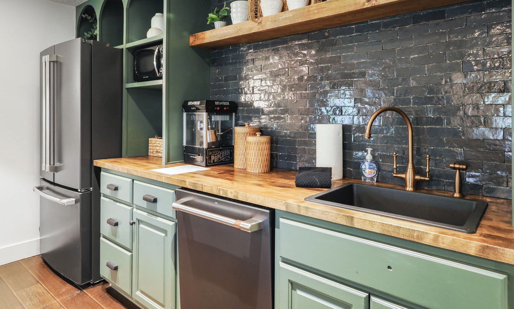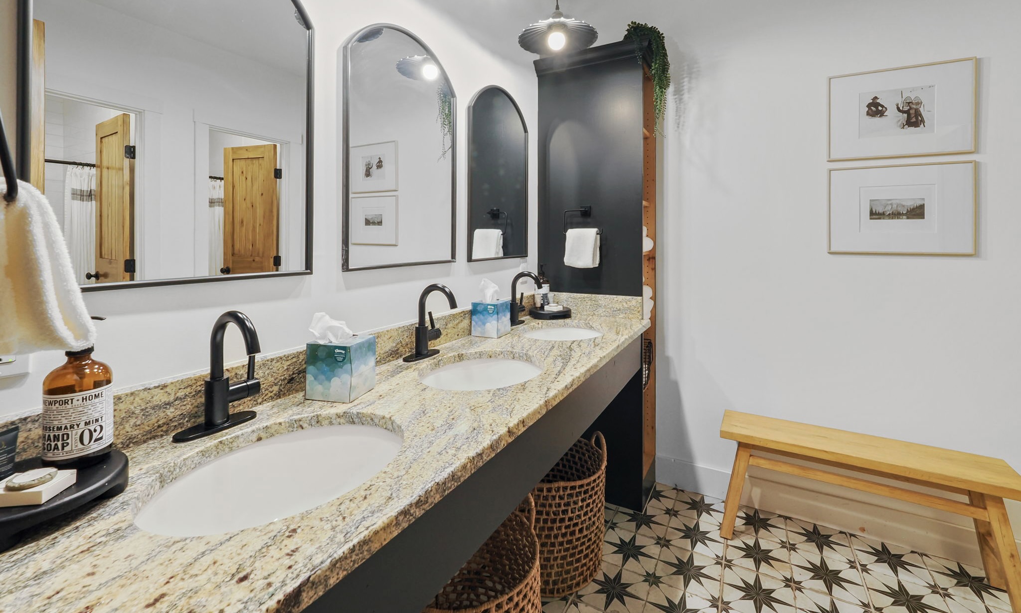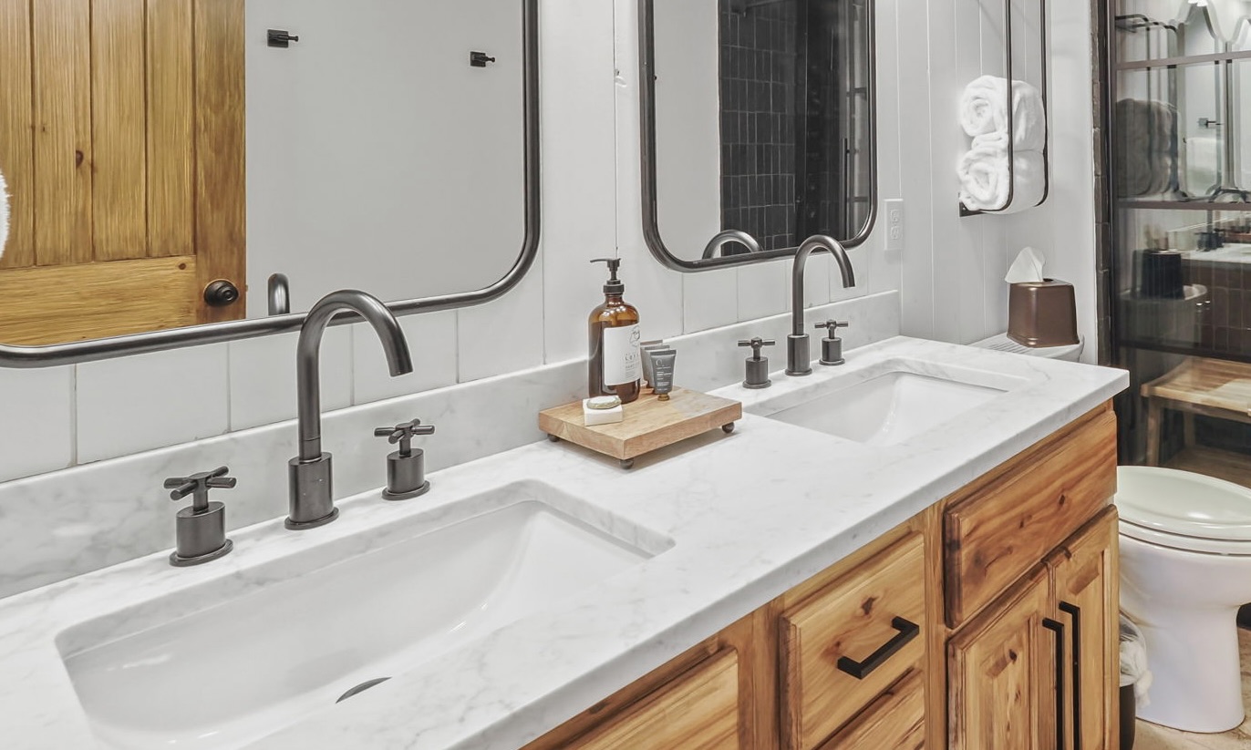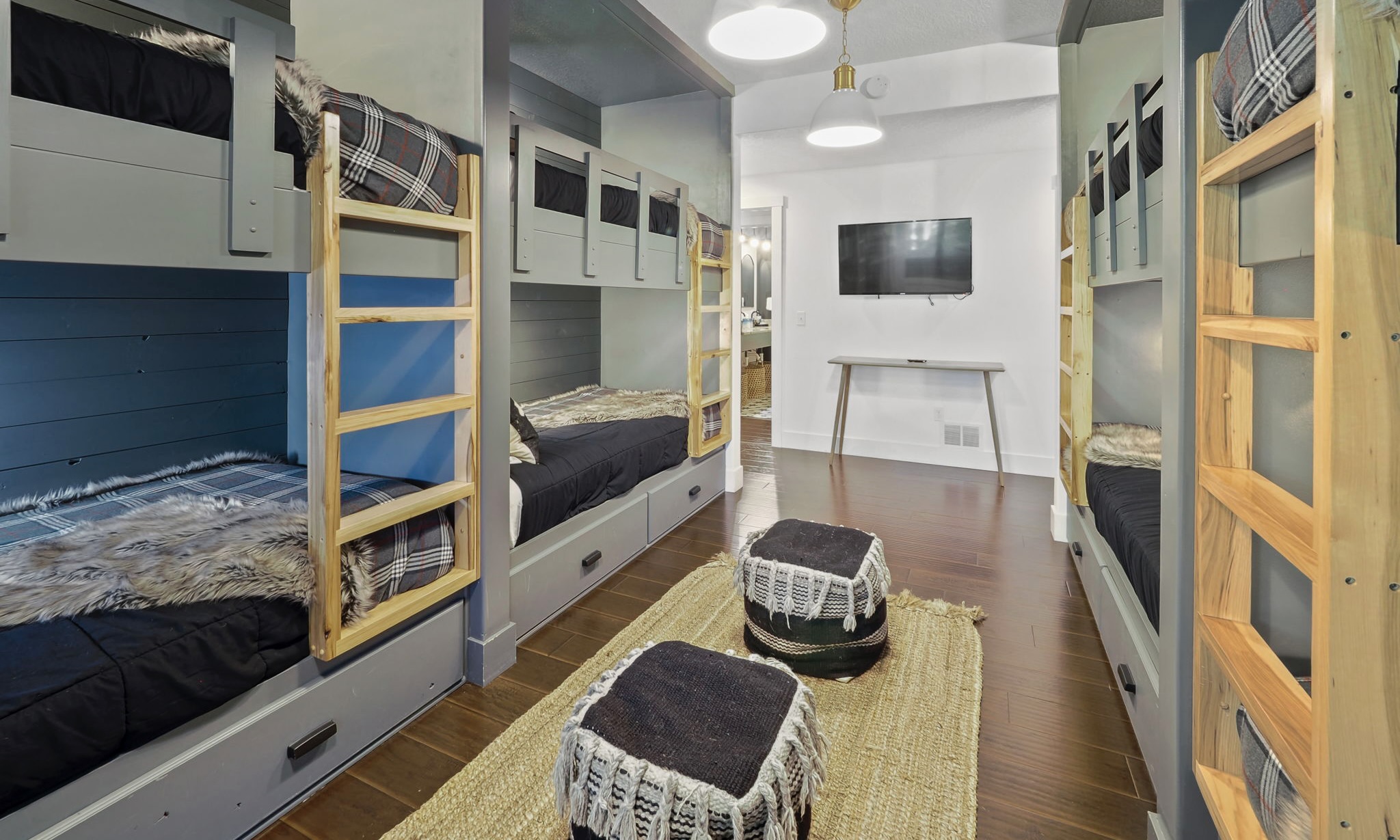 Located on the lower level, "The Bunk Room" features eight custom built bunk beds that can sleep young children and young adults! The lower bathroom has triple sinks and an incredibly ingenious shower set up with 2 single stalled showers so more people can get ready at once.