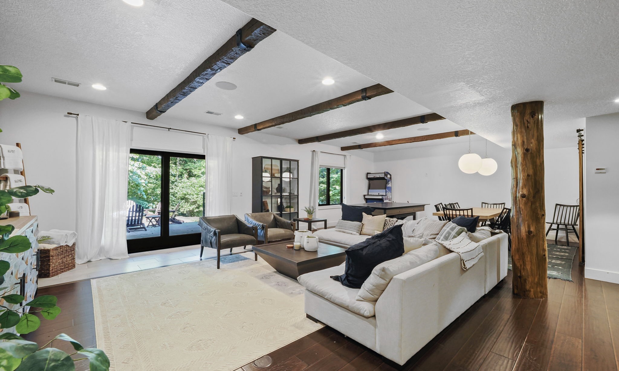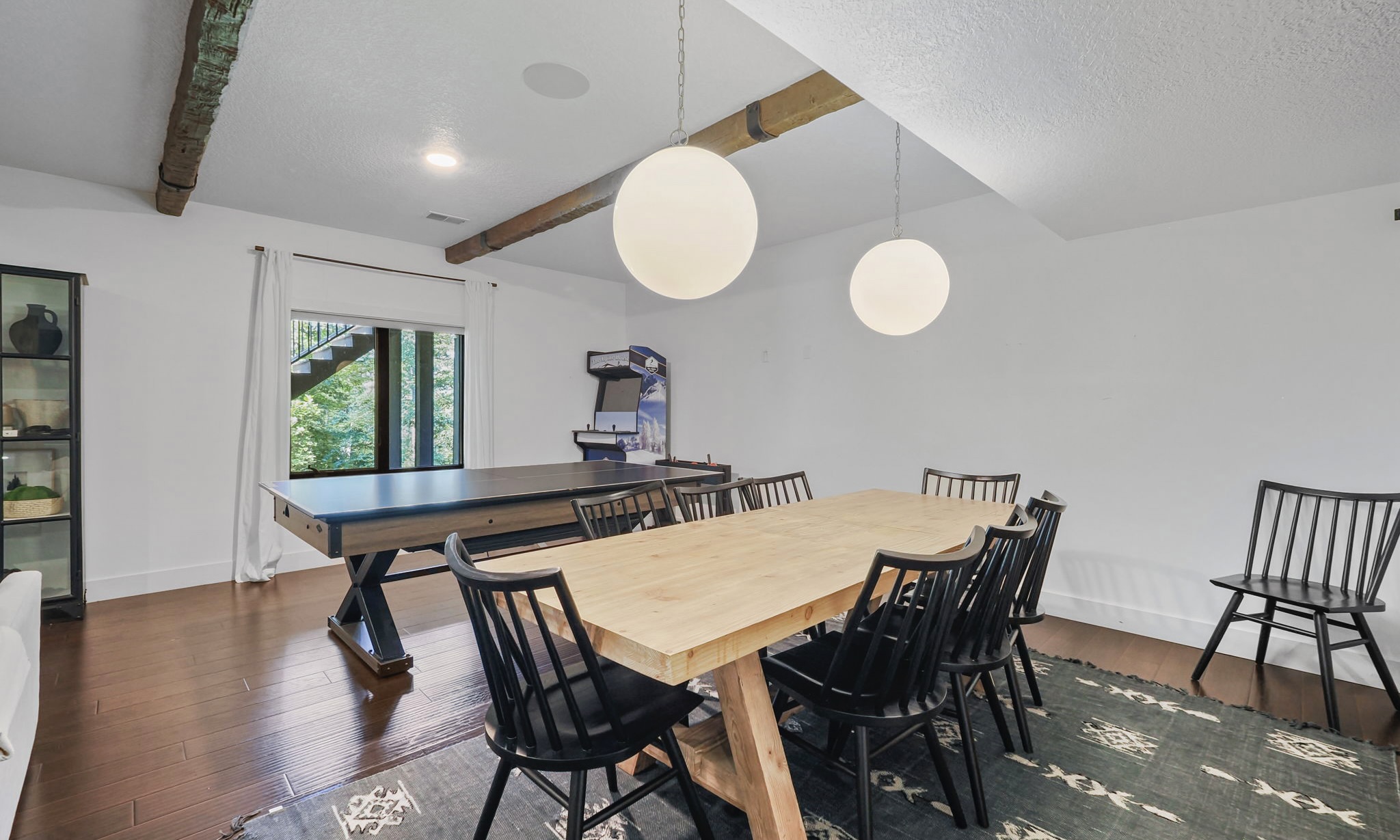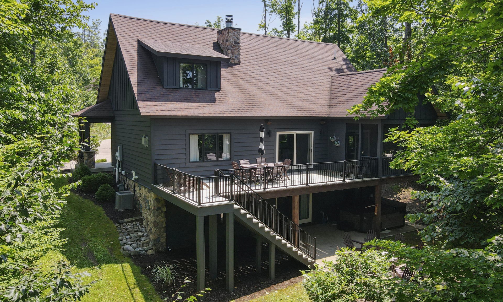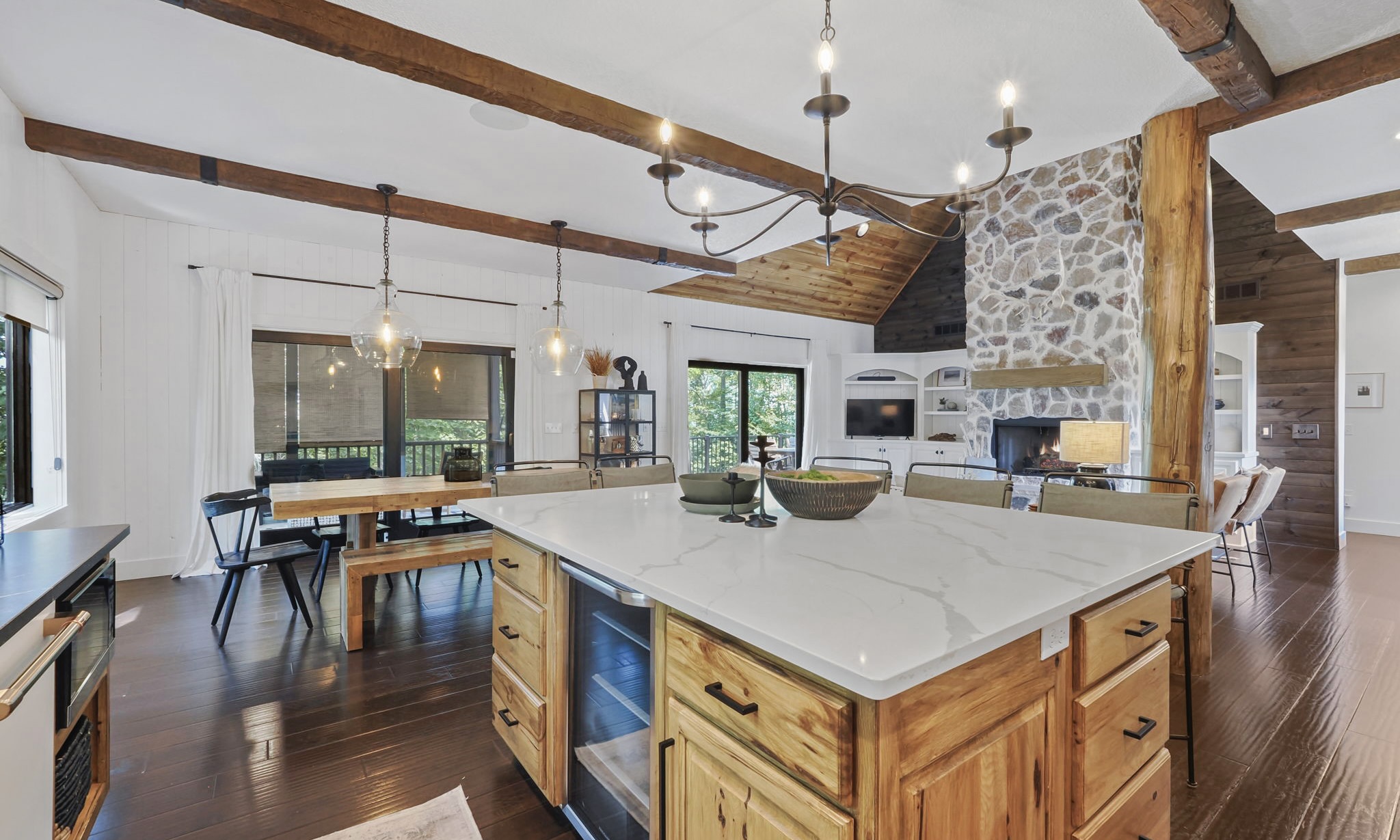 This highly customized home has custom ski storage, gas burning outdoor fire-pit, surround sound throughout the home, bumper pool table, PLUS two large living rooms, allowing everyone in the group to make themselves right at home. For special note, a brand new hot tub has been installed February 2021 and we look forward to guests enjoying this favorite amenity! Speaking of feeling at home, enjoy the spacious kitchen with seating at the dining room table for 10 PLUS 6 bar stools surrounding the oversized island. There is also a 3 season room just off of the dining area with additional seating and amazing views tucked in the beautiful wooded area that surrounds the home.