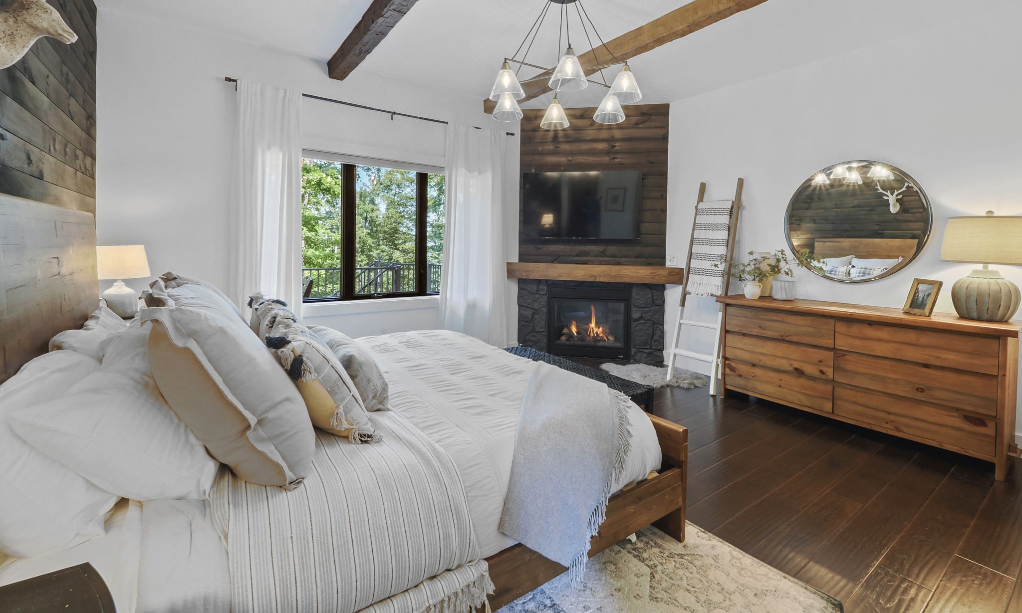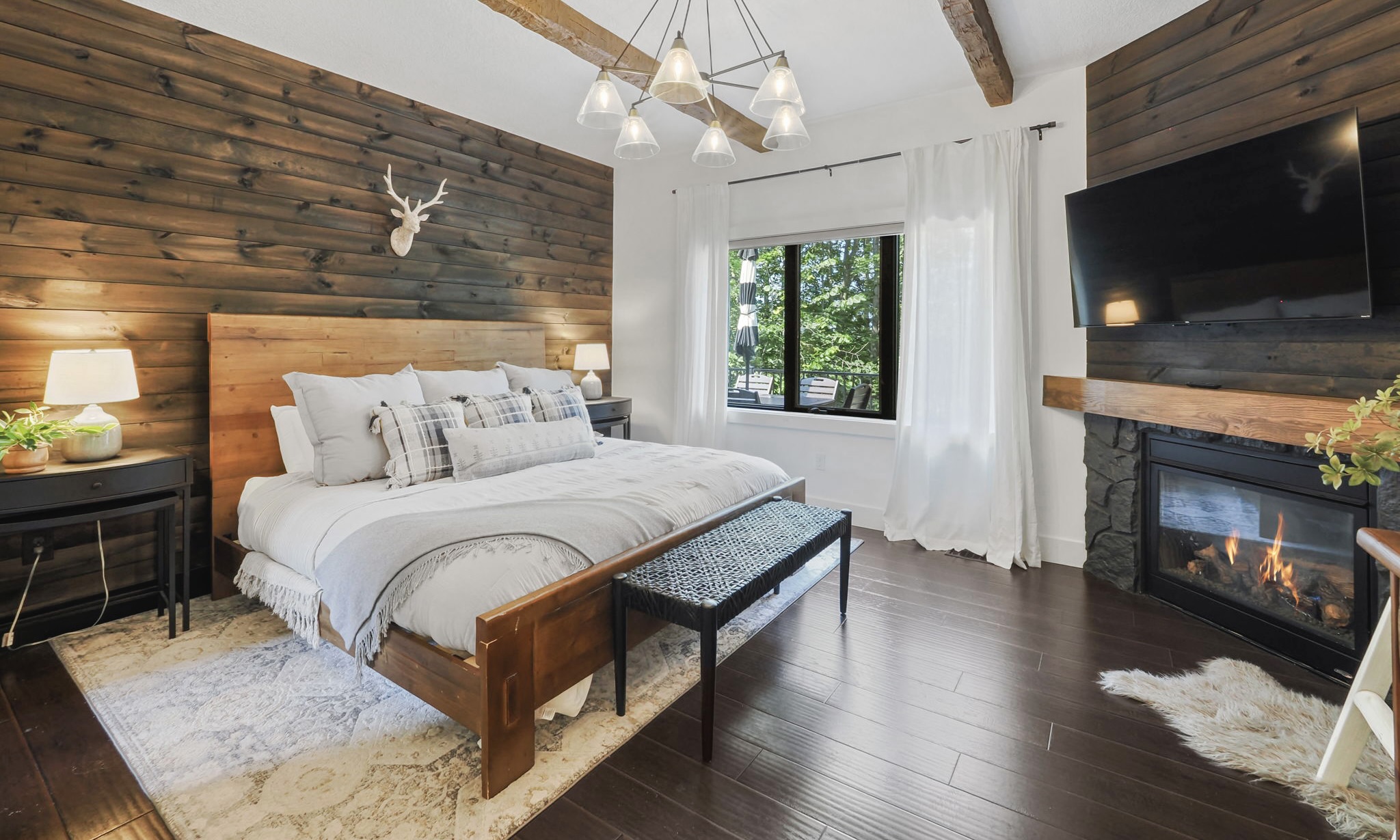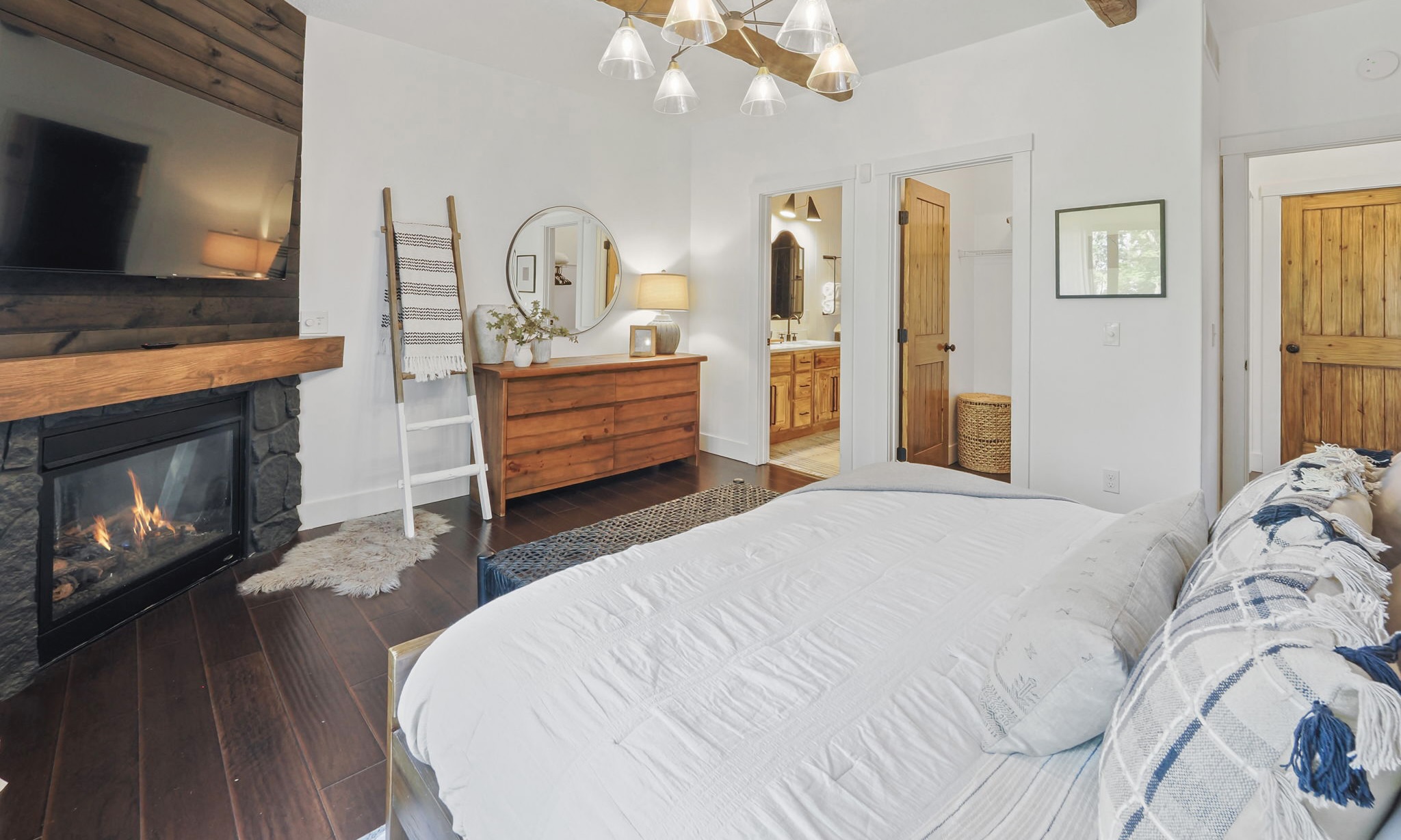 The main level living area has abundant seating, a vaulted ceiling, gas fireplace, and a flat screen TV. For added convenience, there is a powder room located off the main living area. The master bedroom hosts a king bed, en suite bathroom with double sinks and granite countertops. And for added luxury and touch, enjoy your private gas fireplace and flat screen TV, in this beautiful master bedroom!